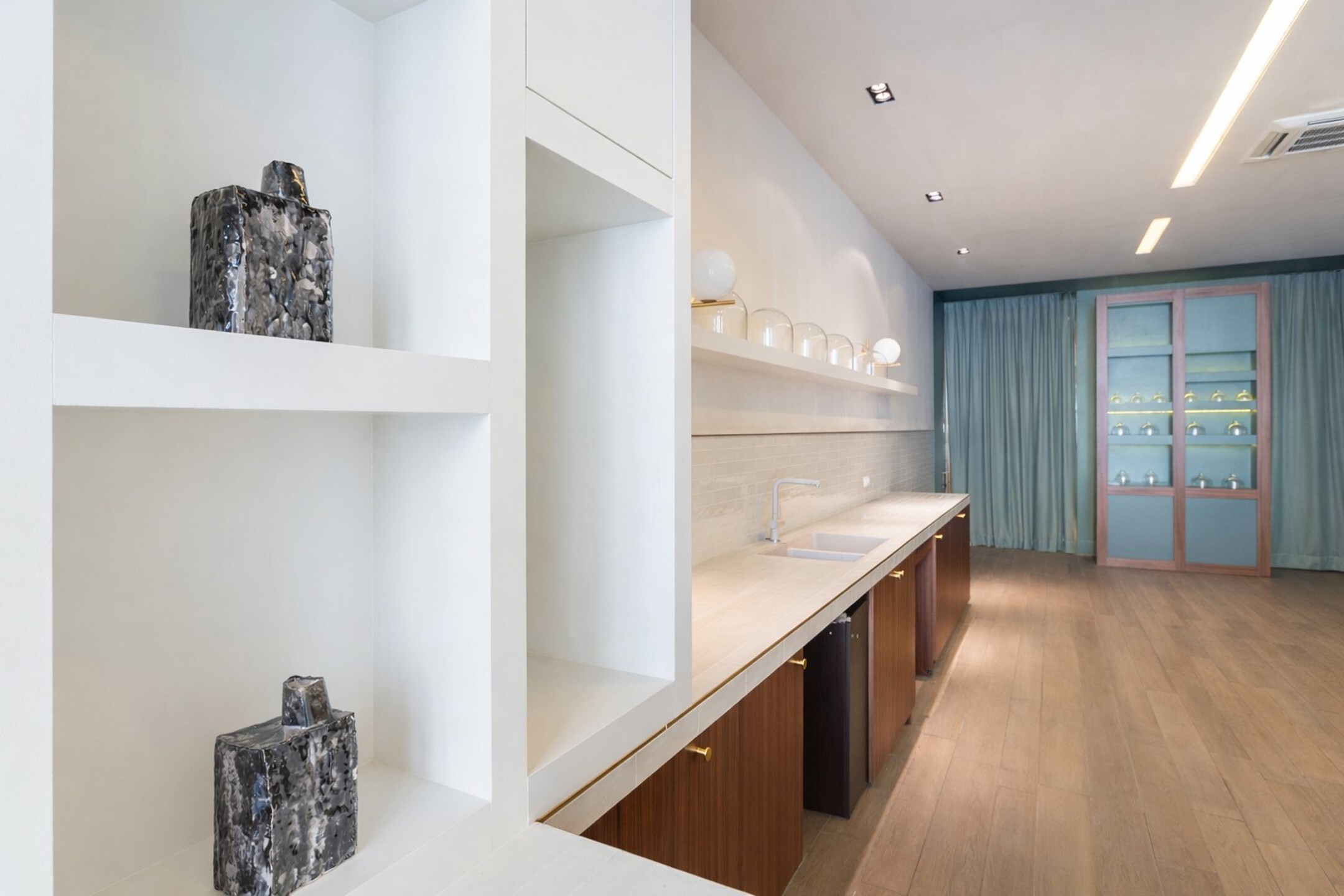 Aan de achterzijde is een kastenwand geplaatst met glas aan weerszijden om een aparte bureauruimte of paskamers te creëren.