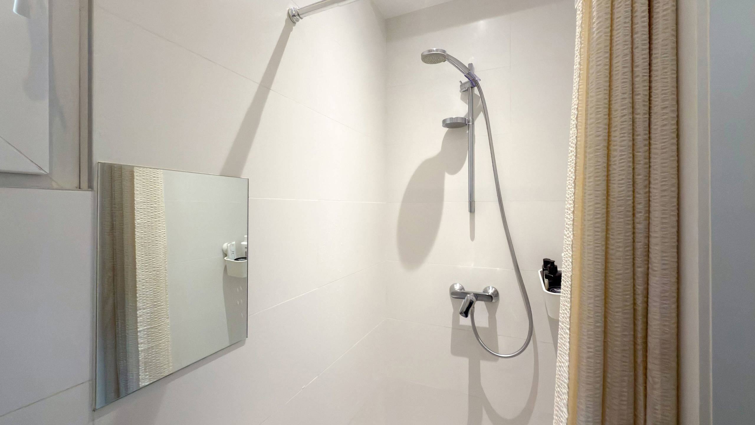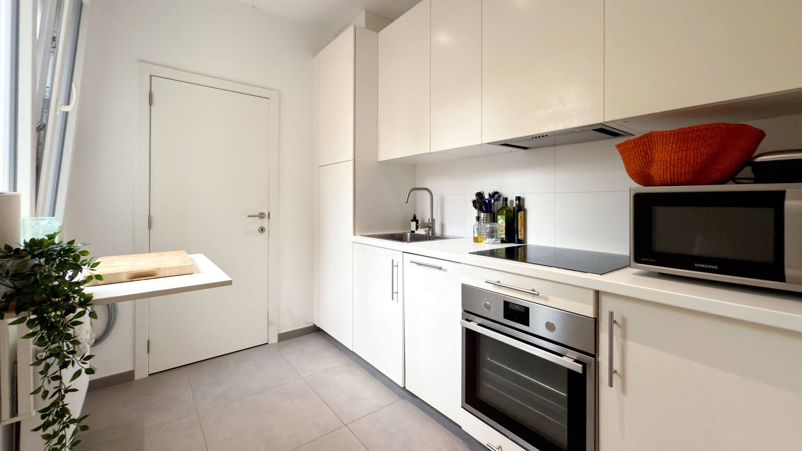 De naastgelegen keuken is uitgerust met de nodige inbouwtoestellen: vaatwasser, vitrokeramisch kookvuur, oven en koelkast met vriesvak. Een wasmachine is hier eveneens voorzien. Achter de keuken bevindt zich de badkamer met toilet, douche en lavabo.