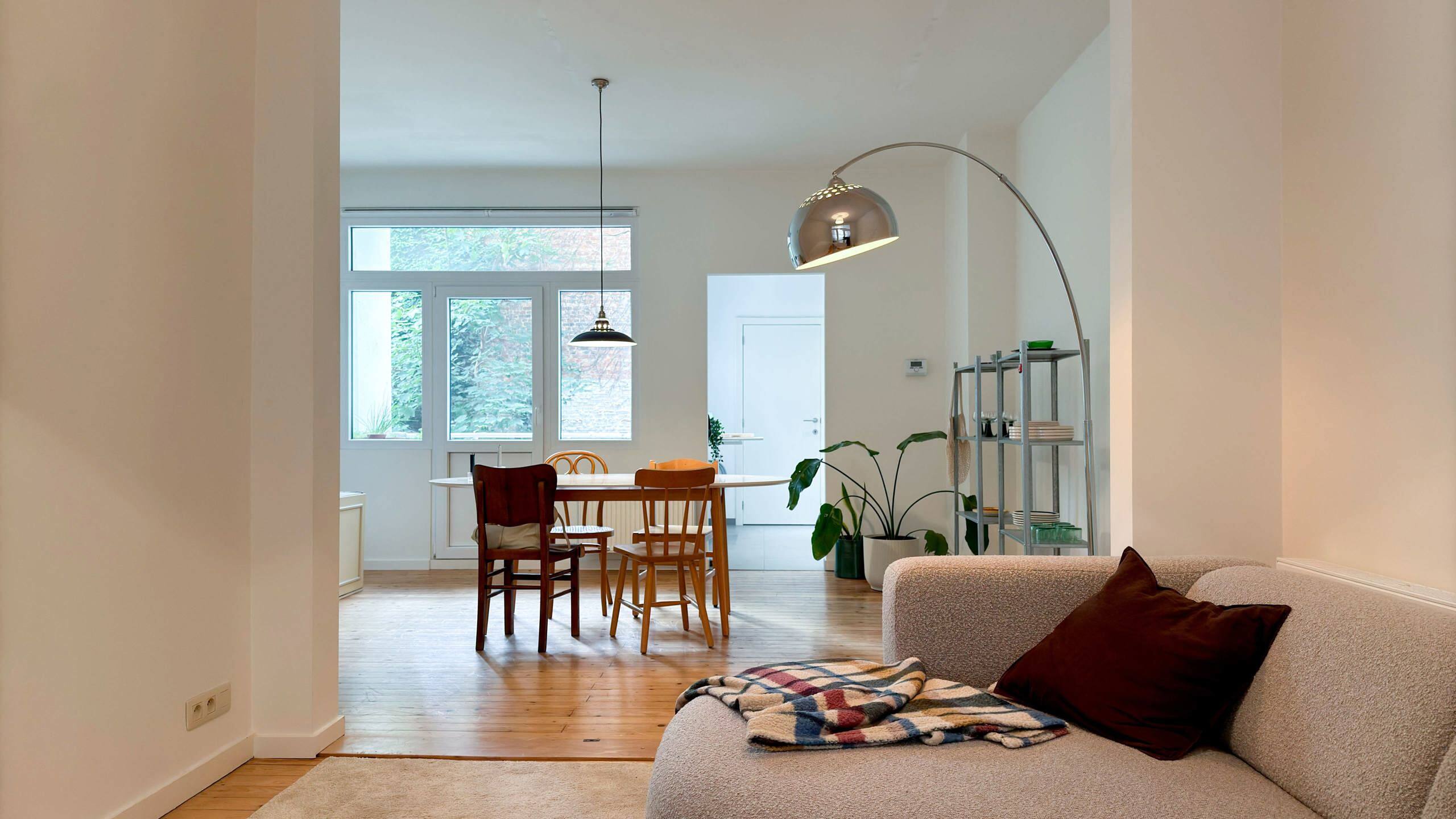 U komt meteen binnen in de lichtrijke leefruimte, deze bevindt zich aan de rustige achterzijde van het appartement en geeft bovendien toegang tot een gezellig zuidelijk georiënteerd terras. De leefruimte is opgesplitst in twee delen die perfect in te richten zijn als eet- en zitruimte.